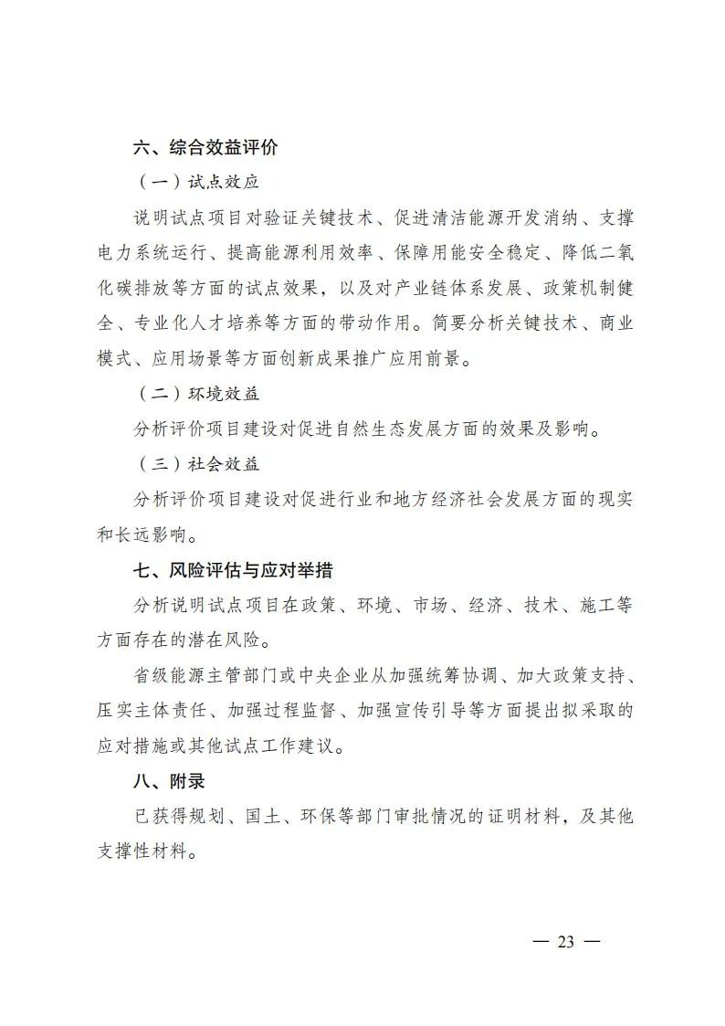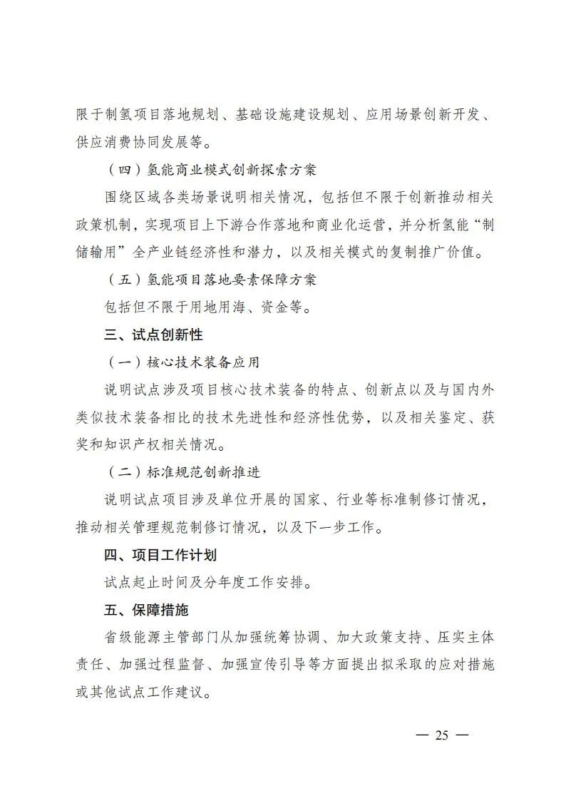 项目试点:依托项目试点推动氢能先进技术与关键装备推广应用,支撑开展各类标准可行性和有效性验证,探索技术先进、模式清晰、可复制推广的项目开发方案。项目试点由业主单位进行申报,以单一试点方向为主。相关项目原则上应已完成核准、备案等工作,确保试点项目顺利投运,商业模式清晰、成本效益明显、减碳效果突出,支持项目应用国家科技重大专项、国家重点研发计划、首台(套)重大技术装备、能源领域研发创新平台等攻关成果,支撑打造技术装备成果推广应用新场景、新模式、新机制,巩固提升氢能产业创新力、竞争力。