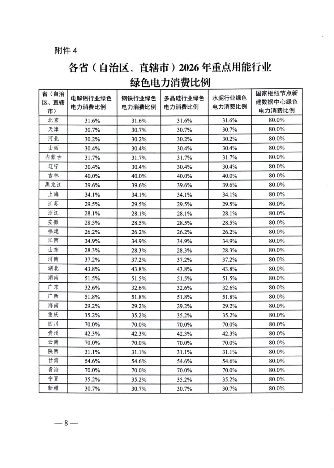 钢铁、水泥、多晶硅行业2025年要求绿电使用比例为25.2%~70%,数据中心则均为80%。其中,30%以上的省份有19个,湖南、广西、甘肃均要求50%以上,四川、青海、云南则为70%。