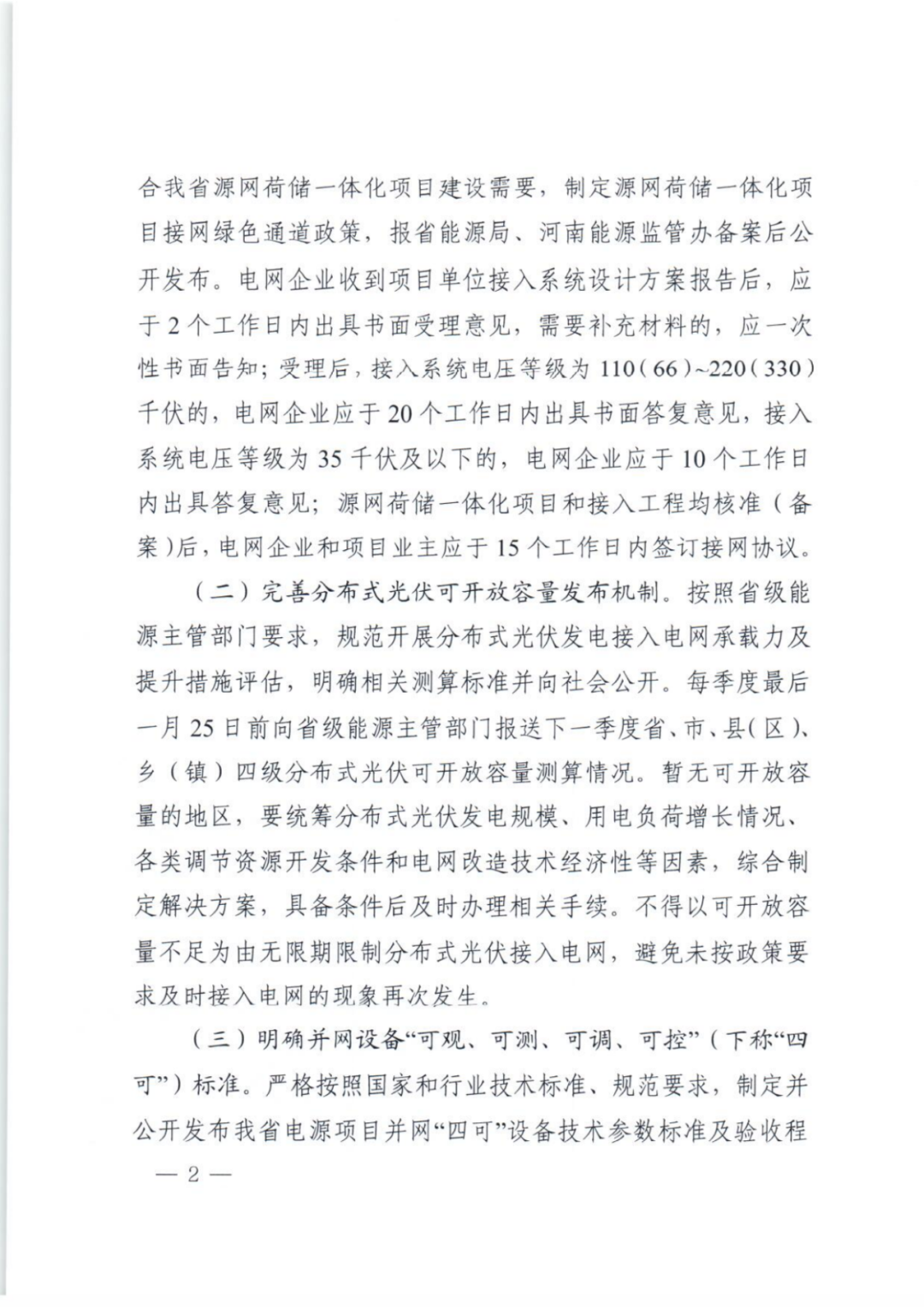 完善分布式光伏可开放容量发布机制。每季度最后一月25日前向省级能源主管部门报送下一季度省、市、县(区)、乡(镇)四级分布式光伏可开放容量测算情况。暂无可开放容量的地区,要统筹分布式光伏发电规模、用电负荷增长情况、各类调节资源开发条件和电网改造技术经济性等因素,综合制定解决方案,具备条件后及时办理相关手续。不得以可开放容量不足为由无限期限制分布式光伏接入电网,避免未按政策要求及时接入电网的现象再次发生。